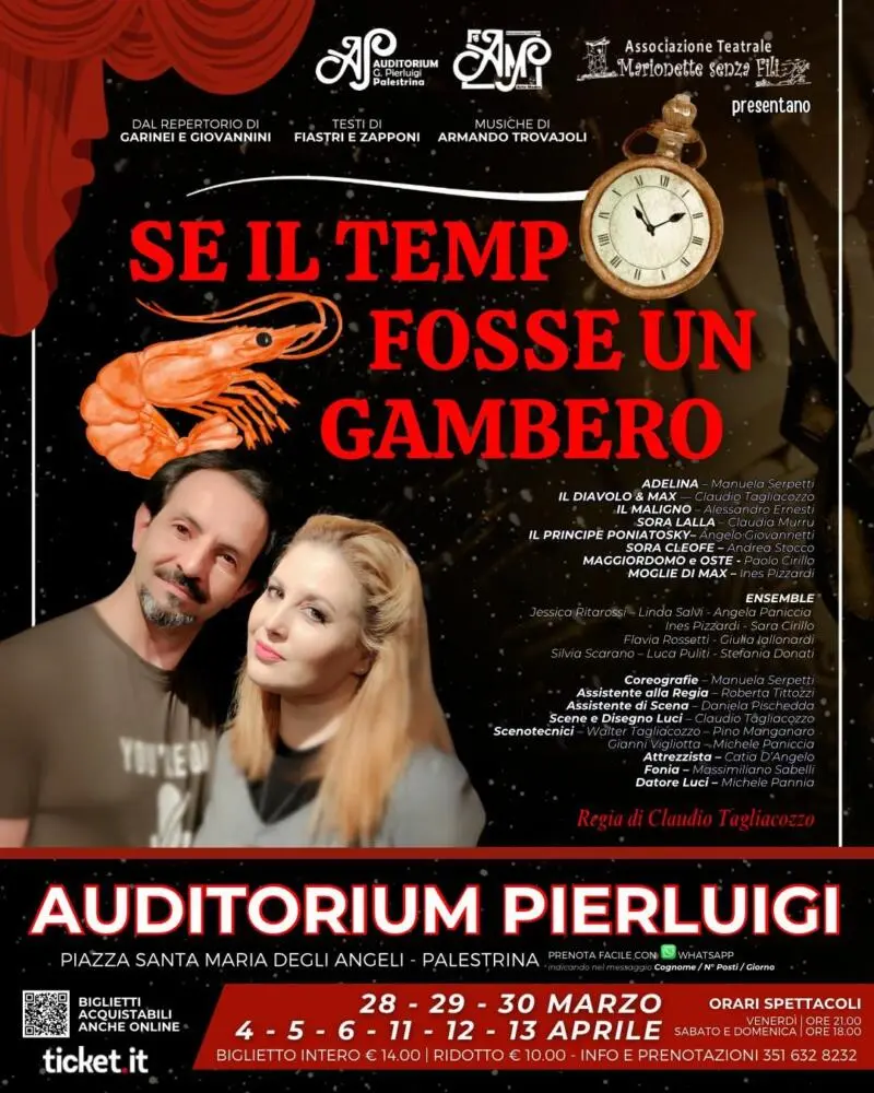 All’Auditorium Pierluigi di Palestrina l’associazione ‘Marionette senza fili’, guidata da Claudio Tagliacozzo, torna in scena con il musical per tutta la famiglia “Se il tempo fosse un gambero”, dal 28 al 30 marzo e dal 4 al 13 aprile (venerdì alle ore 21; sabato e domenica alle ore 18).