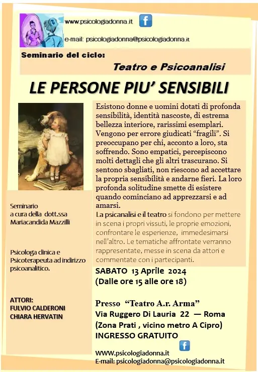SEMINARIO DEL CICLO: TEATRO E PSICOANALISI “LE PERSONE PIU’ SENSIBILI” Esistono donne e uomini dotati di profonda sensibilità, identità nascoste, di estrema bellezza interiore, rarissimi esemplari. Vengono per errore giudicati “fragili”. Si preoccupano per chi, acconto a loro, sta soffrendo. Sono empatici, percepiscono molti dettagli che gli altri trascurano.