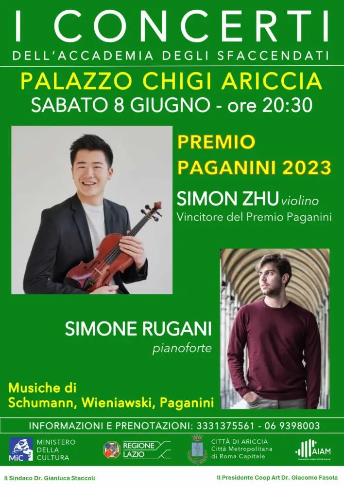 Sabato 8 giugno, alle ore 20:30, per la Stagione 2024 de “I Concerti dell’Accademia degli Sfaccendati”, nella Sala Maestra di Palazzo Chigi ad Ariccia appuntamento con lo straordinario talento violinistico di Simon Zhu, 23 anni, tedesco di Tubinga di origini cinesi, vincitore del Premio Paganini 2023, concorso violinistico tra i più importanti al mondo, scelto da una prestigiosa giuria presieduta da Salvatore Accardo che gli ha anche riservato il raro privilegio di suonare il mitico “Cannone”, violino di Giuseppe Guarnieri del Gesù (1743), già appartenuto a Niccolò Paganini.