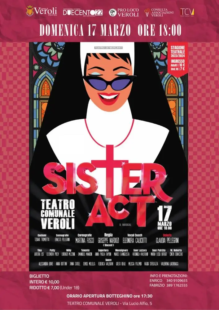 La prima tappa del musical “Sister Act”, del mini tour ciociaro di cinque date della “Compagnia Teatro De’Mercanti”, si terrà Domenica 17 marzo, alle ore 18:00, al Teatro Comunale Veroli.