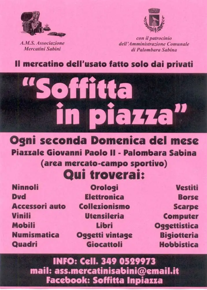 Ddomenica 11 ottobre presso il piazzale Giovanni Paolo II – area mercato (per chi usa il navigatore mettere viale Tivoli), c’è Il mercatino “soffitta in piazza” evento organizzato da disoccupati, cassintegrati, precari del lavoro e pensionati a basso reddito.