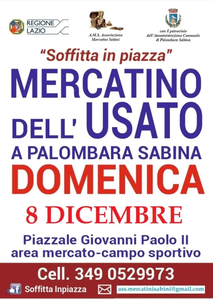 Palombara Sabina, Domenica 8 Dicembre (dalle 8 alle 16) presso l’area mercato (P. Le Giovanni Paolo II) per chi usa il navigatore mettere viale Tivoli, c’è il mercatino “Soffitta in piazza”. Evento organizzato da disoccupati, precari del lavoro, pensionati a basso reddito e privati cittadini che vogliono reagire con dignità (al momento della crisi attuale) privandosi di oggetti, vestiti ecc. che non si usano più partecipando in questo simpatico contesto sociale.