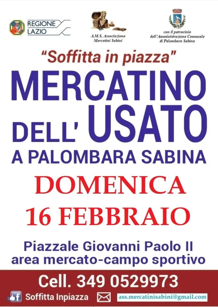 Palombara Sabina , Domenica 16 Febbraio (dalle 8 alle 16) presso l’area mercato (P. Le Giovanni Paolo II) per chi usa il navigatore mettere viale Tivoli, c’è il mercatino “Soffitta in piazza”.