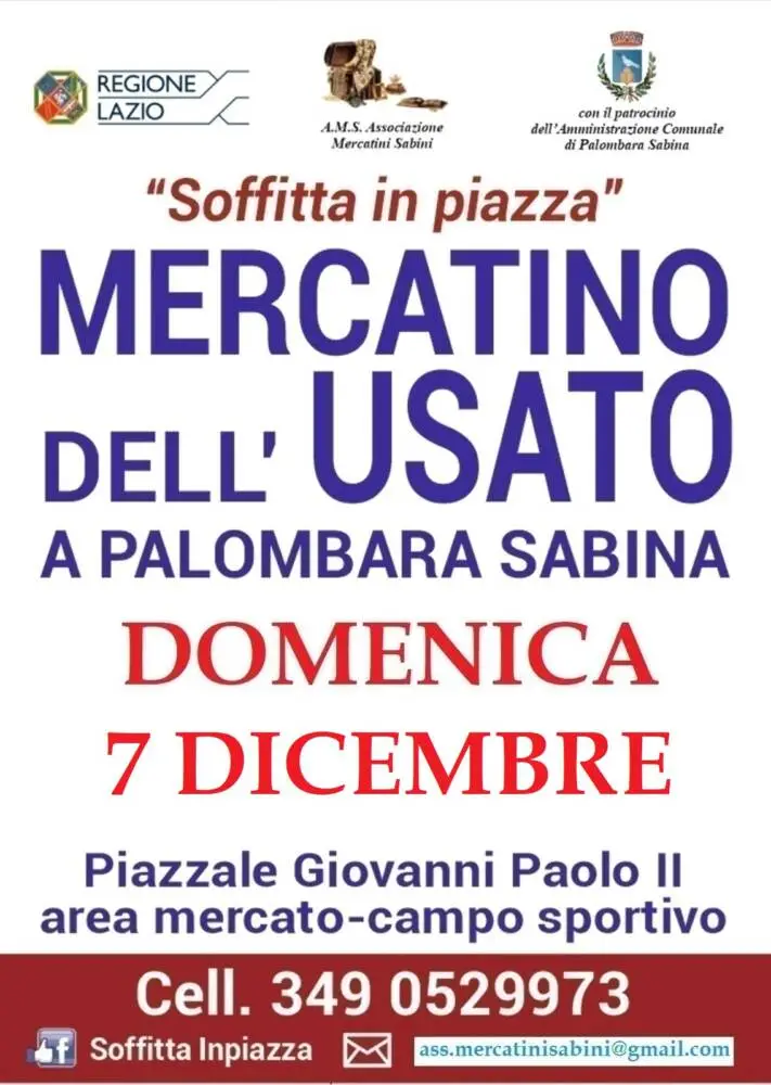 Palombara Sabina, Domenica 7 Dicembre (dalle 8:00 alle 15:00) presso l’area mercato (P.le Giovanni Paolo II°) per chi usa il navigatore mettere Viale Tivoli, c’è il mercatino “Soffitta in Piazza” evento organizzato per favorire disoccupati, precari del lavoro, pensionati a basso reddito e privati cittadini che vogliono reagire con dignità al momento di crisi attuale privandosi di oggetti, vestiti ecc. che non usano più partecipando in questo simpatico contesto sociale.