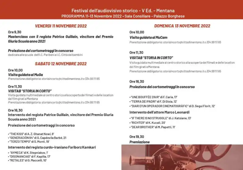 Oltre alle proiezioni, il programma prevede anche Visitab, una visita multimediale, alla scoperta del centro storico e delle location dei film girati a Mentana e visite guidate nei musei cittadini. Tutte le visite sono gratuite con obbligo di prenotazione al 3349911165.