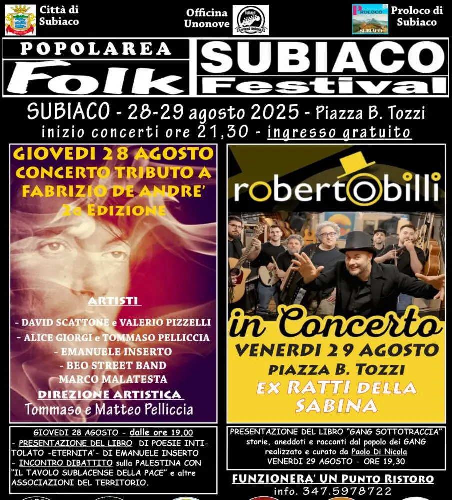 Quest’anno il 28 agosto cominceremo con la seconda edizione concerto tributo a Fabrizio de Andrè con artisti locali e non solo. Come la passata edizione sarà una serata carica di poesia. Secondo giorno, ossia il 29 agosto è la volta del grande artista ROBERTO BILLI, molti lo ricordano come fondatore e cantante dei Ratti della Sabina, sicuramente ci sarà da divertirsi.