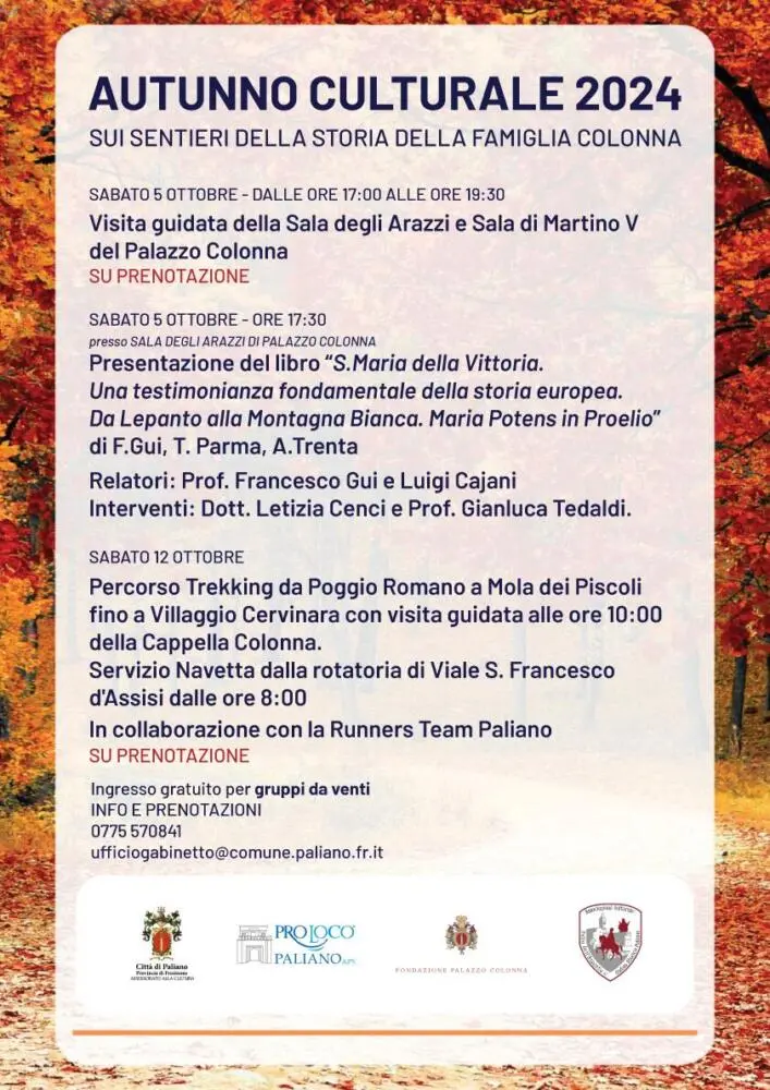 L’Amministrazione Comunale, Assessorato alla Cultura, presenta l’“Autunno Culturale”, un ricco calendario di iniziative a partire da sabato 5 ottobre con “Sui sentieri della storia della famiglia Colonna” un evento in cui, in occasione della ricorrenza della battaglia di Lepanto del 7 ottobre 1571, si terrà, alle ore 17,30 presso la sala degli Arazzi di Palazzo Colonna, la presentazione del libro “S.Maria della Vittoria. Una testionianza fondamentale della storia europea. Da Lepanto alla Montagna Bianca. Maria Potens in Proelio”, relatori pof. Francesco Gui e prof. Luigi Cajani, e con gli interventi della dott.ssa Letizia Cenci e del prof. Gianluca Tedaldi.