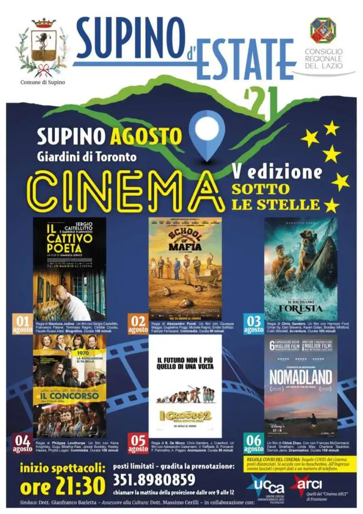 i posti, a causa delle restrizioni imposte dalle norme di contenimento dell’emergenza sanitaria, sono limitati. E’ gradita la prenotazione – la mattina della proiezione dalle ore 9.00 alle ore 12.00 – a questo numero telefonico: 3518980859. I posti a sedere saranno opportunamente distanziati; si potrà accedere soltanto con la mascherina (che può essere tolta una volta arrivati al posto). Inoltre, all’ingresso devono essere lasciati i propri dati e un numero di telefono. “Cinema sotto le stelle” è una iniziativa inserita nella programmazione di “Supino d’Estate” 2021, promossa dalla dalla Presidenza del Consiglio della Regione Lazio in collaborazione con “Quelli del cinema ARCI” di Frosinone e “UCCA” Frosinone