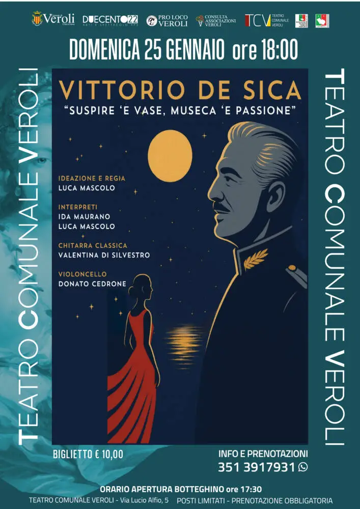 A 50 anni dalla scomparsa di Vittorio De Sica, il Teatro Comunale Veroli è lieto di ospitare una compagnia che con il suo spettacolo “Suspire ‘e vase, Museca ‘e passione” vuole non solo omaggiare il Maestro del Neorealismo, ma anche indagare il suo percorso.