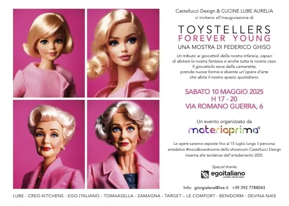 T O Y S T E L L E R S Forever Young, la mostra di Federico Ghiso che ritrae i giocattoli resi bambini grazie all’intelligenza artificiale, dopo il grande successo al MICRO Arti Visive di Roma, l’esposizione al WOW Spazio Fumetto – Museo del Fumetto, dell’Illustrazione e dell’Immagine animata di Milano e al Future Vintage Festival di Padova, entra nel mondo del design con un’esposizione presso lo show room di Castellucci Design Cucine Lube Aurelia a Roma dal 10 maggio al 15 luglio.