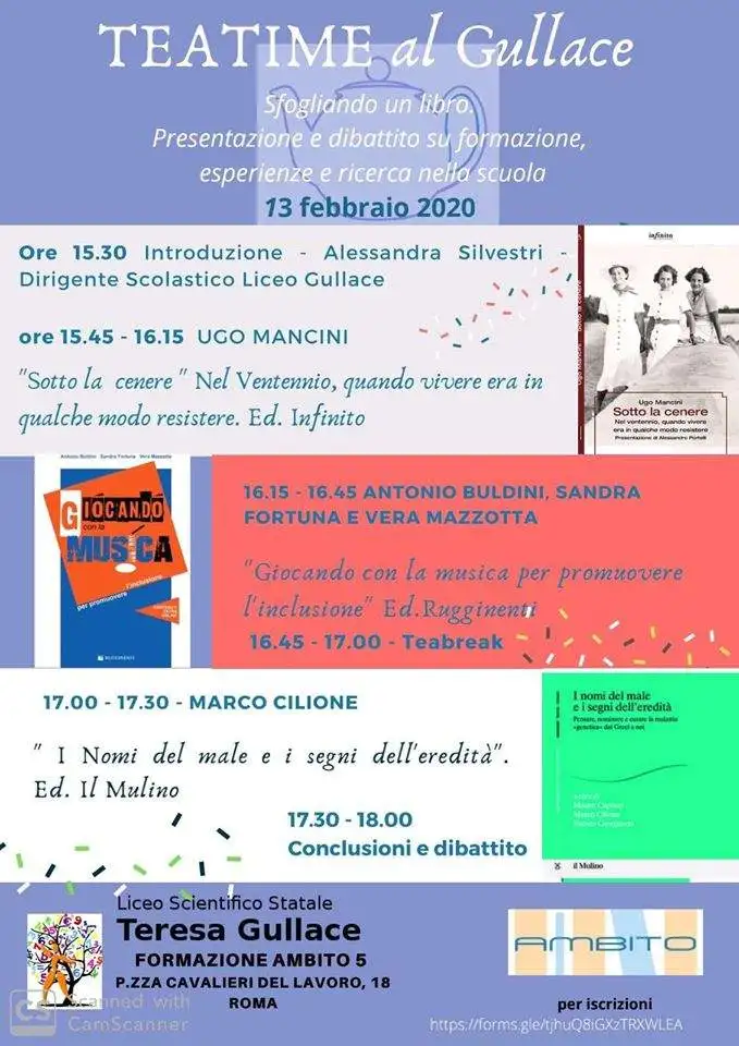 Tornano a Roma i docenti VERA MAZZOTTA, SANDRA FORTUNA e ANTONIO BULDINI a presentare il proprio libro Giocando con la Musica per promuovere l’inclusione, edito quest’anno dall’editore Rugginenti. I docenti saranno ospiti della manifestazione Teatime al Gullace. Sfogliando un libro promossa e curata dal Liceo romano GULLACE-TALOTTA. Tra un libro e l’altro, un the e qualche approfondimento per affrontare temi importanti riguardanti al formazione e la didattica inclusiva.