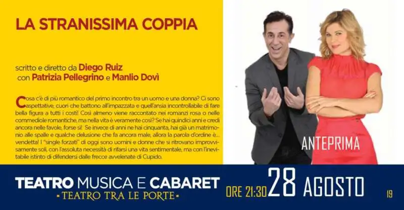 Chiusura venerdì 28 agosto con l’anteprima de “La stranissima coppia” con Patrizia Pellegrino e Manlio Dovì.