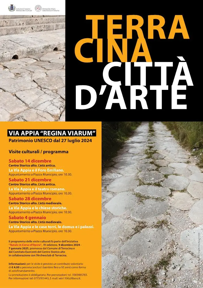Il programma delle visite è organizzato nell’ambito dell’iniziativa “Natale in Corso d’Opera. IV edizione”, dal 10 dicembre 2024 al 6 gennaio 2025, promossa dal Comune di Terracina e dal Comitato Esercenti del Centro Storico alto di Terracina in collaborazione con l’Archeoclub di Terracina. Per maggiori dettagli: Terracinaalta
