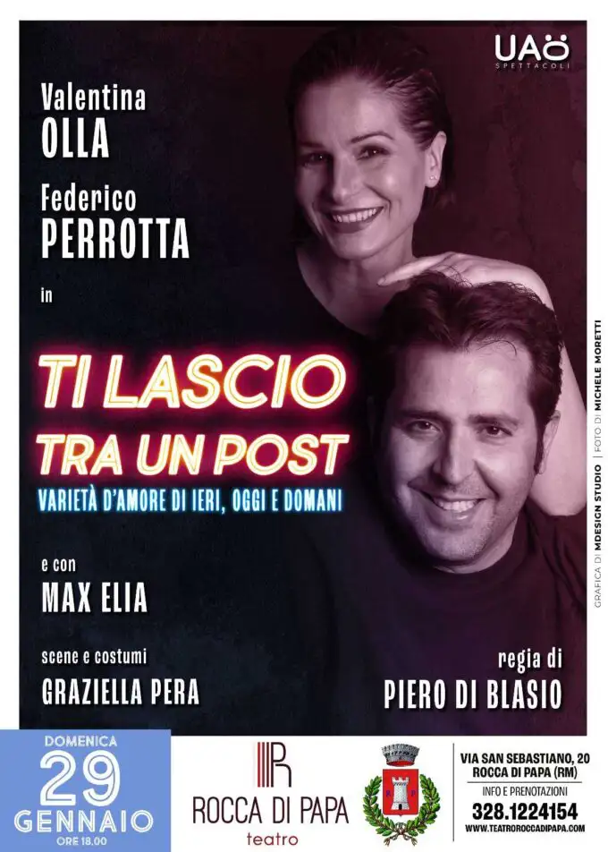 Musica, divertimento, risate: c’è un mix di emozioni sul palco con il “varietà d’amore di ieri, oggi e domani” by Uao Spettacoli e che reca la firma di Federico Perrotta e Valentina Olla, I Perrollas, impegnati in uno spettacolo dal titolo attuale “Ti lascio tra un post” ma dai toni quasi televisivi e nostalgici, per la nuova regia di Piero Di Blasio. Le scene e i costumi sono di Graziella Pera.
