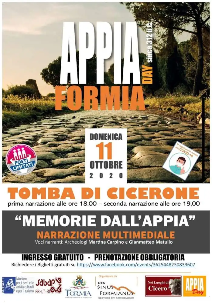 APPIA DAY – Memorie dall’Appia .Partendo dal tema dei monumenti sepolcrali costruiti lungo l’Appia Antica,Gianmatteo Matullo, archeologo accreditato presso la Soprintendenza SA-BAP Lazio per le Province di Latina Frosinone e Rieti, introdurrà i partecipanti al tema delle sepolture romane e dei rituali funebri dell’epoca .Al racconto dell’archeologo, basato su dati scientifici ed effettuato secondo modalità divulgative, consuete nell’ambito delle attività di RTA Sinus Formianus, seguirà una “Narrazione Multimediale” dal titolo “Memorie dall’Appia”; Voci narranti Archeologi Martina Carpino e Gianmatteo Matullo. L’Iniziativa si basa sul racconto multimediale incentrato su una serie iscrizioni funerarie di epoca romana realmente esistenti, che narrano emozioni, aspirazioni,speranze e frammenti della vita quotidiana di duemila anni fa.La lettura dei testi, di grande impatto emotivo, sarà effettuata a cura degli archeologi della RTA Sinus Formianus e sarà accompagnata dalla proiezione di immagini di grandi dimensioni, sulla superficie della Tomba di Cicerone.Tali proiezioni saranno rese ancora più suggestive da musiche e sonorizzazioni a tema; si intende in tal modo creare un’esperienza immersiva che trasporti i partecipanti nella vita di tutti i giorni di duemila anni fa.