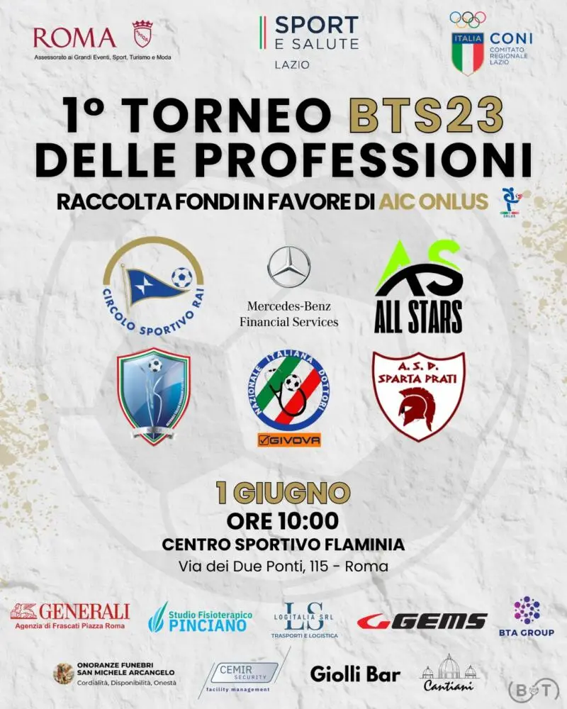 Sta per arrivare a Roma la prima edizione del Torneo BTS23 delle Professioni: un evento di calcio a 8 finalizzato alla raccolta fondi in favore di AIC Onlus, che vedrà coinvolte associazioni sportive, liberi professionisti, dipendenti di società private e impiegati della Pubblica Amministrazione. BTS 23, associazione di servizi per lo sport fondata da Diana Bellucci e Valerio Troiani, lancia una campagna di donation crowdfunding, il cui ricavato sarà destinato ad AIC Onlus per realizzare insieme un progetto di calcio giovanile a carattere sociale. È possibile sostenere la raccolta fondi sul sito: www.gofundme.com/f/1-torneo-bts-23-per-aiconlus