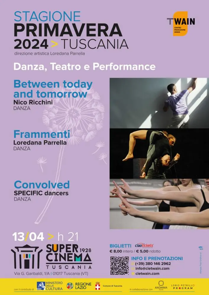 Sabato 13 aprile 2024 alle ore 21 il Supercinema di Tuscania ospita per la Stagione Primavera 2024 a cura di Twain Centro Produzione Danza tre pièces di danza: “Convolved” con SPECIFIC dancers, danzatori del corso di perfezionamento professionale 23/24 diretto da Loris Petrillo; la nuova produzione “Frammenti” di Loredana Parrella, un’indagine poetica dell’arbitrarietà del confine tra individui che invita il pubblico a riflettere sulle guerre che si combattono dentro e fuori di sé; e la prima internazionale di “Between today and tomorrow”, assolo di e con Nico Ricchini, freelance dance artist e danzatore della Akram Khan Company, docente ospite dell’edizione 2024 di MATCH, workshop che riunisce danzatori provenienti da tutto il mondo e ospita artisti internazionali della scena contemporanea, un progetto esclusivo di Loris Petrillo promosso e organizzato con Anonima Teatri, in collaborazione con Twain Centro di Produzione Danza.
