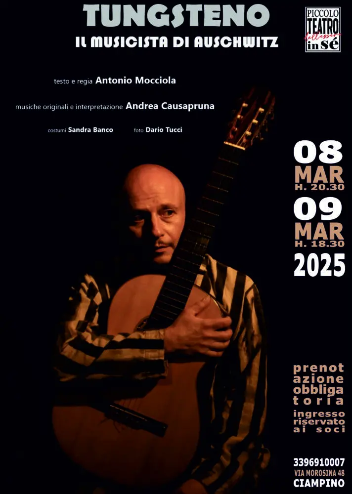 Andrea Causapruna suona dal vivo alla chitarra alcuni tra i più intensi brani del suo repertorio, e debutta come attore in un monologo potente e struggente, scritto per lui da Antonio Mocciola. Un viaggio originale e insolito, sospeso tra il dolore e la poesia, leggero e soave come un sogno di libertà, duro e gelido come pietra di tungsteno. Per non dimenticare gli orrori di una guerra che – come un incubo – torna ancora adesso a turbare i nostri sonni.