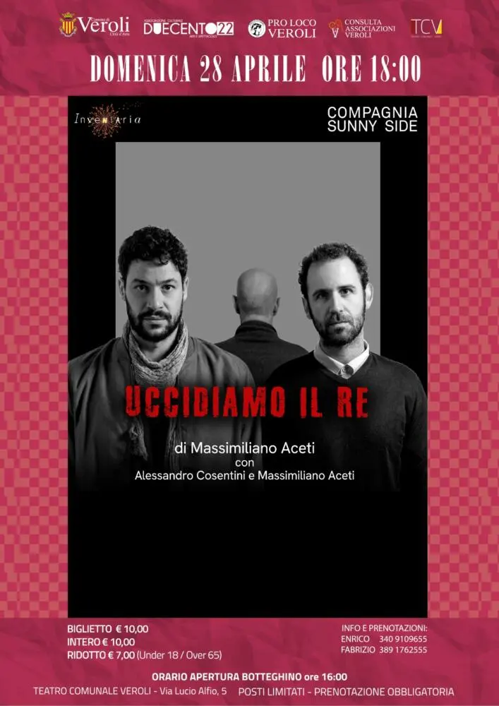 Tutti pronti, quindi, per l’ultimo spettacolo, come di consueto alle ore 18:00 e con apertura botteghino alle 17:30, per assistere a “Uccidiamo il re”, proposto dalla “Compagnia Sunny Side” e scritto e diretto da Massimiliano Aceti.