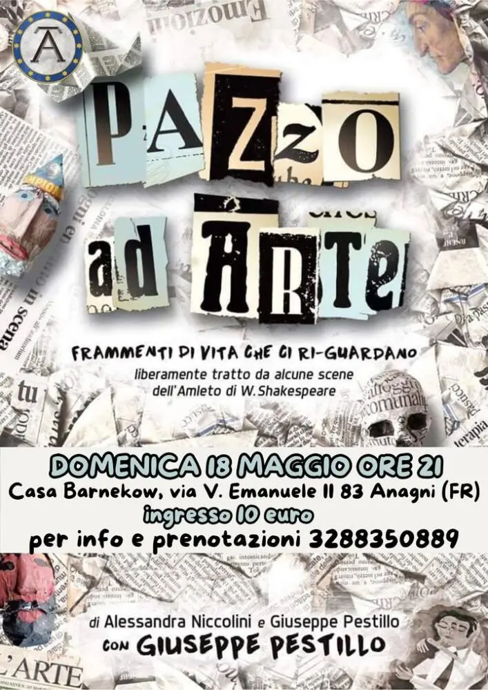 Domenica 18 maggio, sempre alle ore 21:00, PAZZO AD ARTE – FRAMMENTI DI VITA CHE CI RI-GUARDANO: liberamente tratto da alcune scene dell’Amleto di William Shakespeare, lo spettacolo di Alessandra Niccolini e Giuseppe Pestillo, e con Giuseppe Pestillo, si avvale in buona parte della meravigliosa traduzione di Orazio Costa Giovangigli, regista e maestro di teatro. Ne è venuta fuori una performance per un solo attore che pone gli spettatori faccia a faccia con la contemporaneità di alcune amletiche vicende e che ha come scopo primario quello di far comprendere e apprezzare quanto più possibile la rilevanza universale del pensiero shakespeariano.