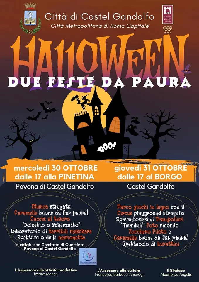 Mercoledì 30 ottobre, in collaborazione con il Comitato di Quartiere Pavona di Castel Gandolfo, dalle 17 ci si divertirà a “La Pinetina”, nel parco giochi in via Sano Spirito in località Pavona di Castel Gandolfo con musica spaventosa, tantissimi giochi, caccia al tesoro, laboratori, spettacolo delle marionette e caramelle buone da far paura.