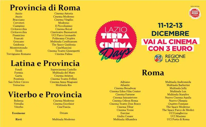 L’ANEC, Associazione Nazionale Esercenti Cinematografici del Lazio, aderisce alla manifestazione LAZIO TERRA DI CINEMA DAYS, un’iniziativa promossa dalla Regione Lazio con l’obiettivo di sostenere il cinema e stimolare nel pubblico una maggiore frequentazione delle sale cinematografiche. Per tre giorni – da domenica 11 a martedi 13 dicembre – si avrà infatti l’opportunità di vivere la magia che solo la sala cinematografica riesce a trasmettere nella visione di un film sul maxi schermo, pagando il biglietto di ingresso a soli 3 euro.