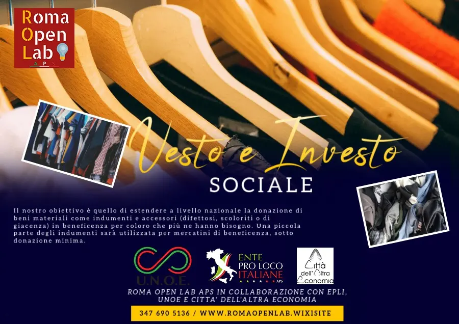 Vesto e Investo Sociale è un Evento Sociale per trasformare la solidarietà in azione concreta. Roma Open Lab APS, in collaborazione con il Dipartimento Sociale PRO LOCO EPLI e UNOE, presenta il progetto Vesto e Investo Sociale, iniziativa che unisce inclusione e sostegno sociale.