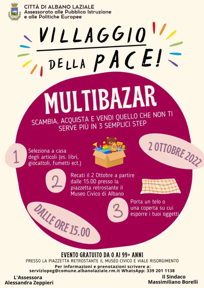 L’Assessorato alla Pubblica Istruzione e alle Politiche Europee è lieto di invitare l’intera cittadinanza all’evento “Villaggio della PACE” che si terrà domenica 2 ottobre presso la piazzetta retrostante il Museo Civico “M. Antonacci” e Viale Risorgimento di Albano Laziale.