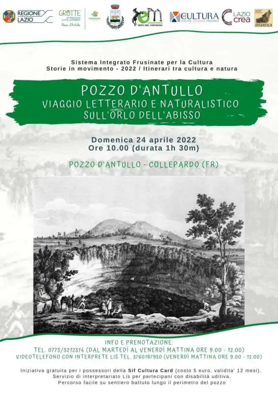 Domenica 24 aprile, alle ore 10.00, POZZO D’ANTULLO – VIAGGIO LETTERARIO E NATURALISTICO SULL’ORLO DELL’ABISSO a Collepardo Ecomuseo Orto del Centauro Chirone. Un itinerario tra cultura e natura con esperti e interpreti LIS – SP ENS Frosinone. Offerta culturale gratuita con la card del circuito territoriale integrato (costo 5 euro, validità 12 mesi) Info e [...]...