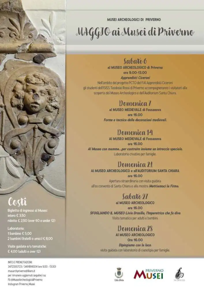 Sulla locandina il nutrito programma di MAGGIO 2023 dei Musei Archeologici di Priverno