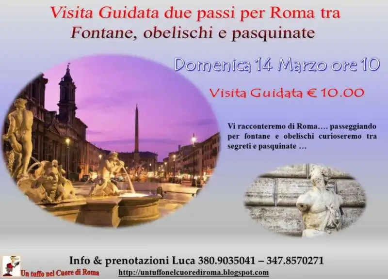 Vi racconteremo di Roma…. passeggiando tra piazze fontane e obelischi curioseremo tra segreti e pasquinate … Domenica 14 Marzo ore 10 Visita Guidata € 10,00 Info e prenotazioni (Luca – Guida autorizzata) 380.9035041 alicetta1974@gmail.com http://untuffonelcuorediroma.blogspot.com...