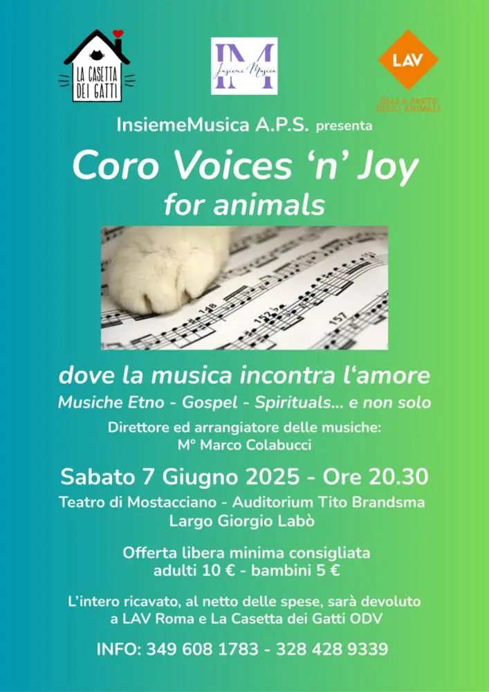 Inauguriamo l’attività della nostra neonata associazione con questo concerto benefit all’insegna dell’amore per gli animali, con la partecipazione di LAV Roma e La Casetta dei Gatti ODV, a cui sarà devoluto tutto il ricavato al netto delle spese. Protagonista della serata sarà il coro Voices ‘n’ Joy che in questo concerto eseguirà brani etno, spiritual, [...]...