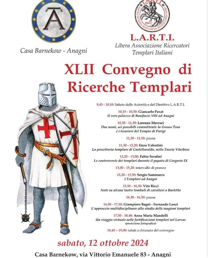Sabato 12 ottobre, per tutto il giorno, dalle ore 9:45, Casa Barnekow avrà il gradissimo privilegio di ospitare il XLII Convegno di Ricerche Templari, a cura della L.A.R.T.I. Libera Associazione Ricercatori Templari Italiani (il programma completo sarà pubblicato nei prossimi giorni).