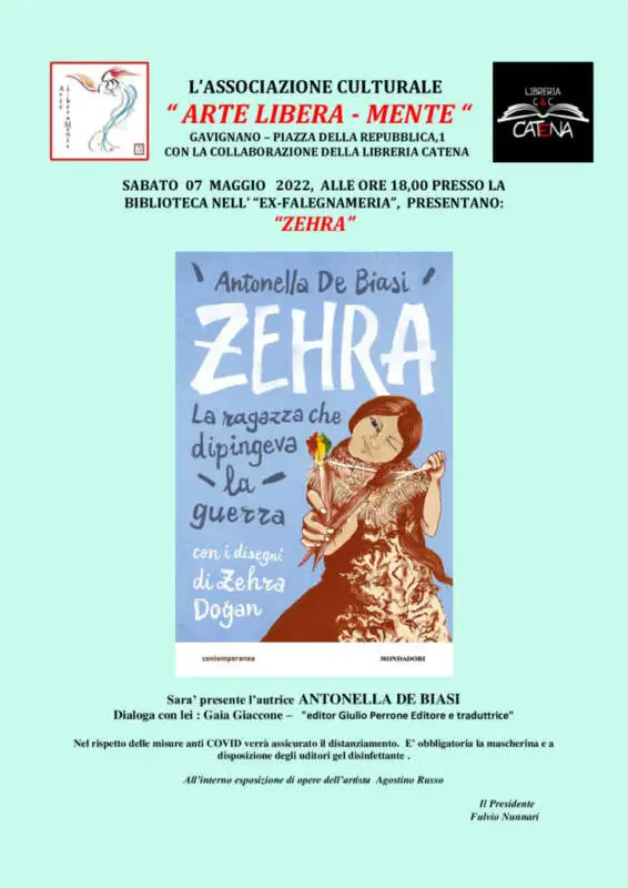 Antonella De Biasi, narra la storia di questa “bambina”, ormai grande ed affermata pittrice e giornalista, nel suo libro “Zehra, la ragazza che dipingeva la guerra”, che presenterà nella biblioteca di Gavignano sabato 7 maggio 22 alle ore 18,00. Storia incredibile, assurda, inaccettabile, inconcepibile, eppure vera.