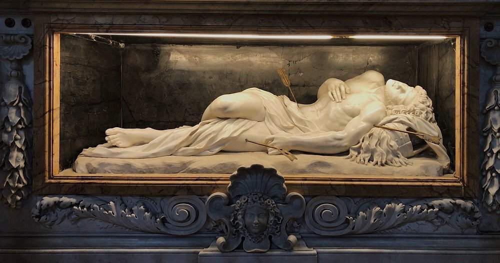 - La Cripta di San Sebastiano: Cuore del complesso, ospita l’altare dove un tempo riposava il corpo del Santo. Qui domina la scena il capolavoro scultoreo di Giuseppe Giorgetti (su disegno di Gian Lorenzo Bernini): una statua in marmo che ritrae il santo martire nel momento supremo, trafitto dalle frecce.