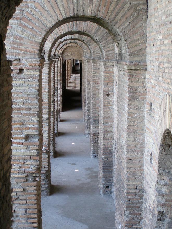 Questo cortile doveva probabilmente servire come sede di uffici per le guardie del dazio e controllo merci. L’Arco di Druso risale al III secolo e faceva parte dell’Acquedotto Antoniniano, che trasportava l’acqua fino alle Terme di Caracalla.