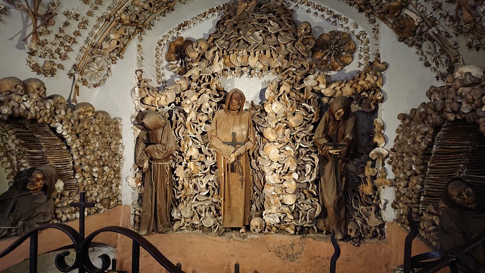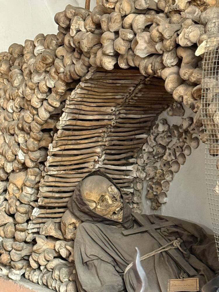 Superato il museo, una piccola scala conduce il visitatore nel luogo più celebre e sconvolgente del complesso: la Cripta. Questo non è un ossario comune, ma un’opera d’arte unica nel suo genere, un capolavoro barocco realizzato con il più umile dei materiali: le ossa umane.