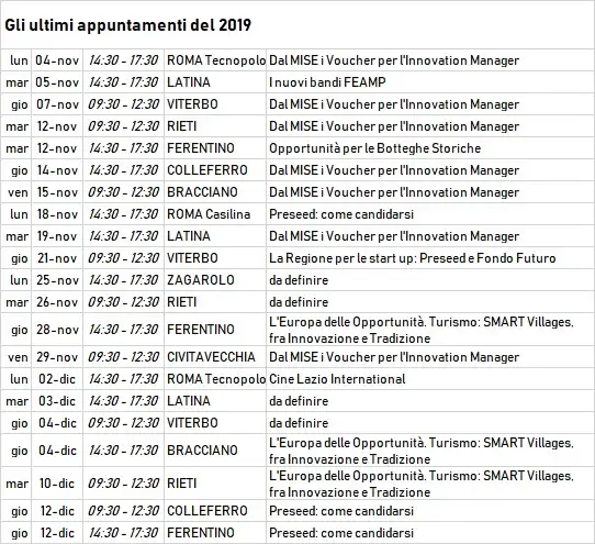 Gli incontri, gratuiti e della durata di 3 ore, si rivolgono ad enti, associazioni di categoria, imprese, startup e a tutti i cittadini interessati a conoscere gli avvisi, le agevolazioni ed i bandi legati al mondo imprenditoriale.