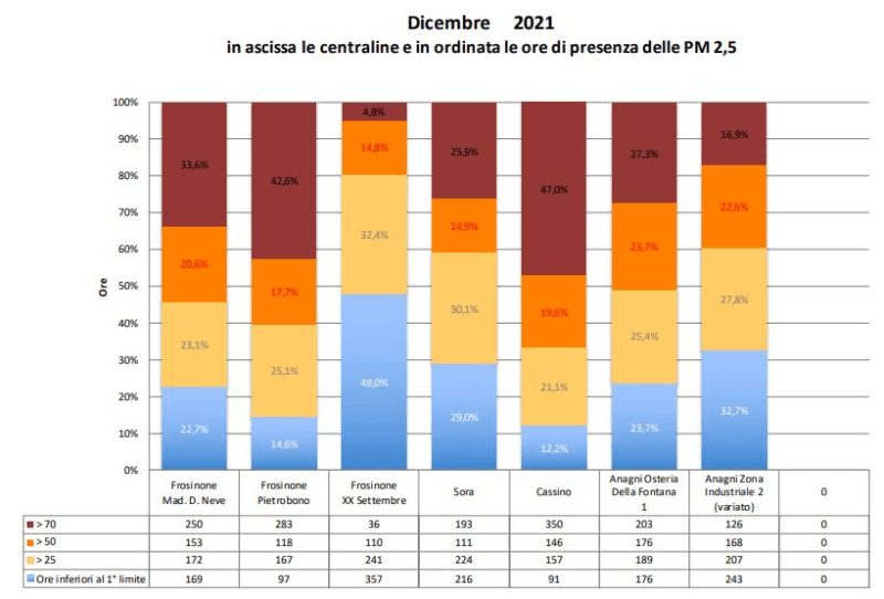 Ad Anagni i valori peggiori si registrano ad Osteria della Fontana con periodi del 20% entro il limite, del 23% oltre il doppio del limite e del 27% oltre tre volte la media ammessa. A Sora il 30% del tempo entro il limite, il 15% oltre il doppio, il 30% con valori tre volte l’ammesso. Cassino presenta i dati peggiori rispetto tutti gli altri comuni: solo il 12% del tempo del mese nei valori limiti, il 20% del tempo oltre il doppio ed il 47% di dicembre con esposizione a concentrazioni superiori tre volte il limite della media ammessa.