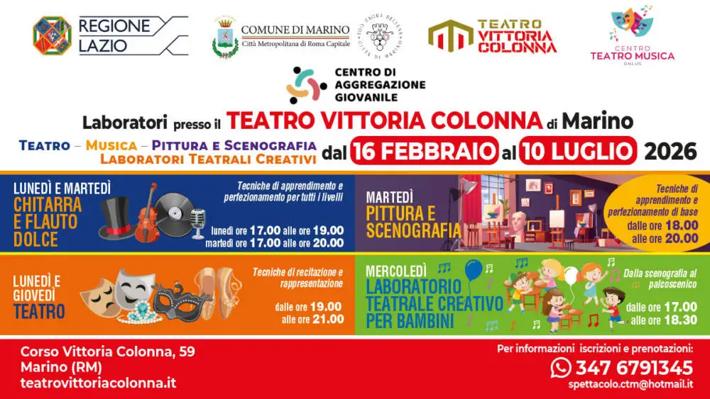 Dopo la pausa per le Festività natalizie a partire dal 15 febbraio 2026 riprenderanno le attività dei Laboratori gratuiti, fortemente voluti dal Direttore artistico del Teatro “Vittoria Colonna” di Marino Giorgio Granito e dal Centro di aggregazione giovanile costituitosi lo scorso anno presso il Comune di Marino.