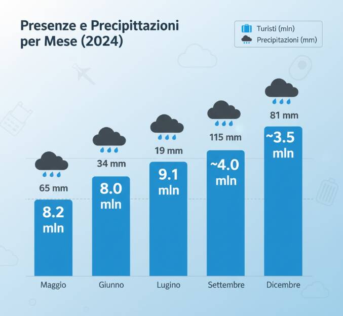 La differenza è evidente: a luglio, con solo 19 mm di precipitazioni, l’Italia accoglie 9,9 milioni di turisti. A novembre, con 115 mm, il flusso scende a circa 4 milioni. Questo significa musei più liberi, hotel disponibili e la possibilità di vedere la vera Italia senza caos turistico.